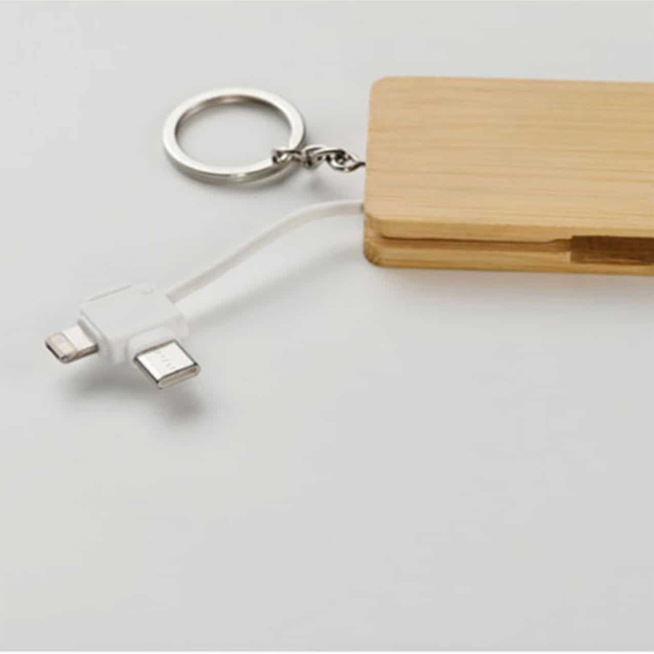 Брелок виготовлений із натурального бамбука, завдяки чому виглядає елегантно та екологічно. Він обладнаний універсальними зарядними перехідниками, що підходять до більшості сучасних пристроїв - тож корисність такого подарунка гарантується в повсякденному житті.