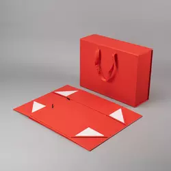 Коробка складна з твердого, переплетеного картону, з двома ручками, вкрита дизайнерським папером. Кришка на магнітах.