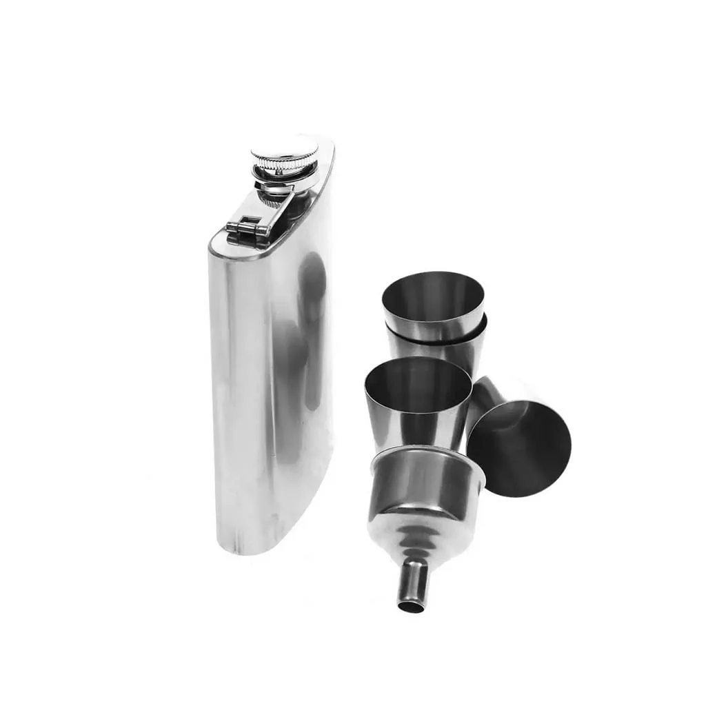 Набор из нержавеющей стали в состав которого входит фляга объемом 220 мл, 4 рюмки объемом по 30 мл и воронка. Фляга с одинарной стенкой. Крышка фляги оснащена держателем.