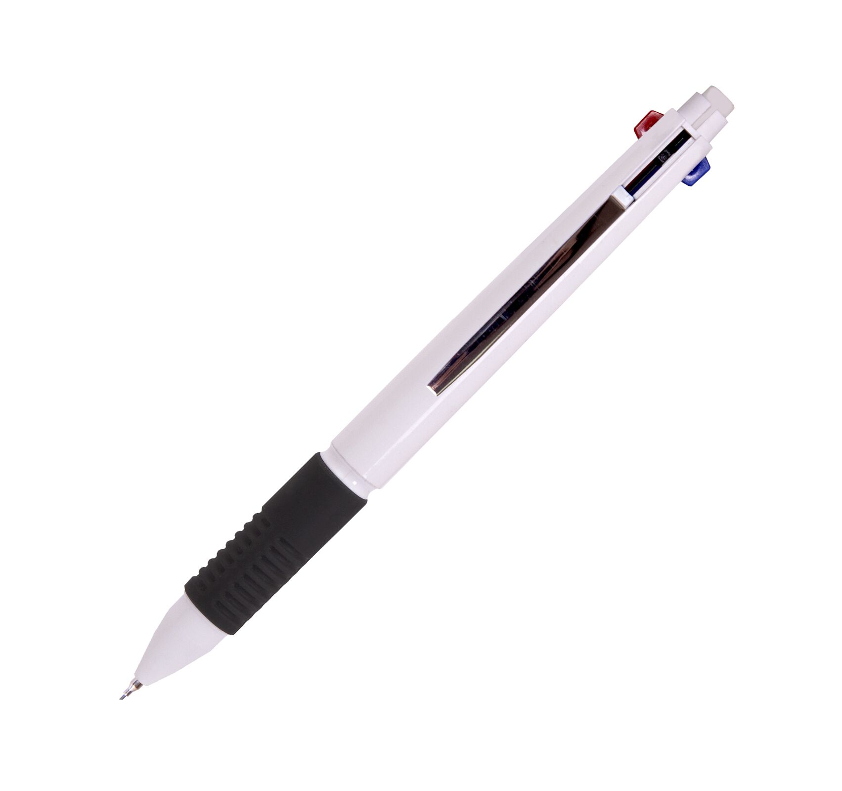 Ручка шариковая многофункциональная 4 в1 Mumbai с белым корпусом. мягкой силиконовой резинкой, для удобного удерживания в руке. Четыре функции в одной ручке: черные, синие и красные чернила и карандаш, на кончике резинка для карандаша.