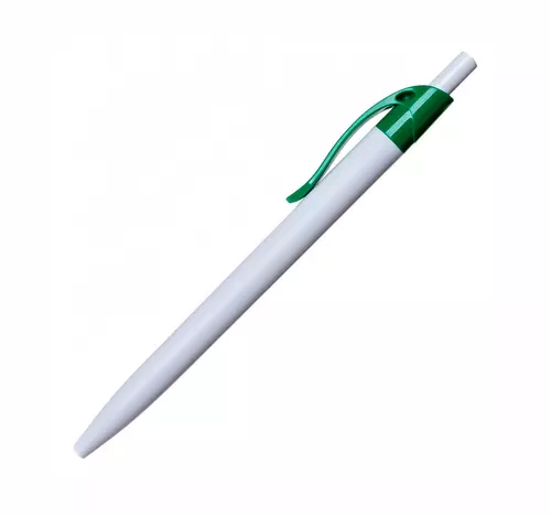 Многоразовая пластиковая ручка с цветным изогнутым клипом. Механизм - кнопочный.