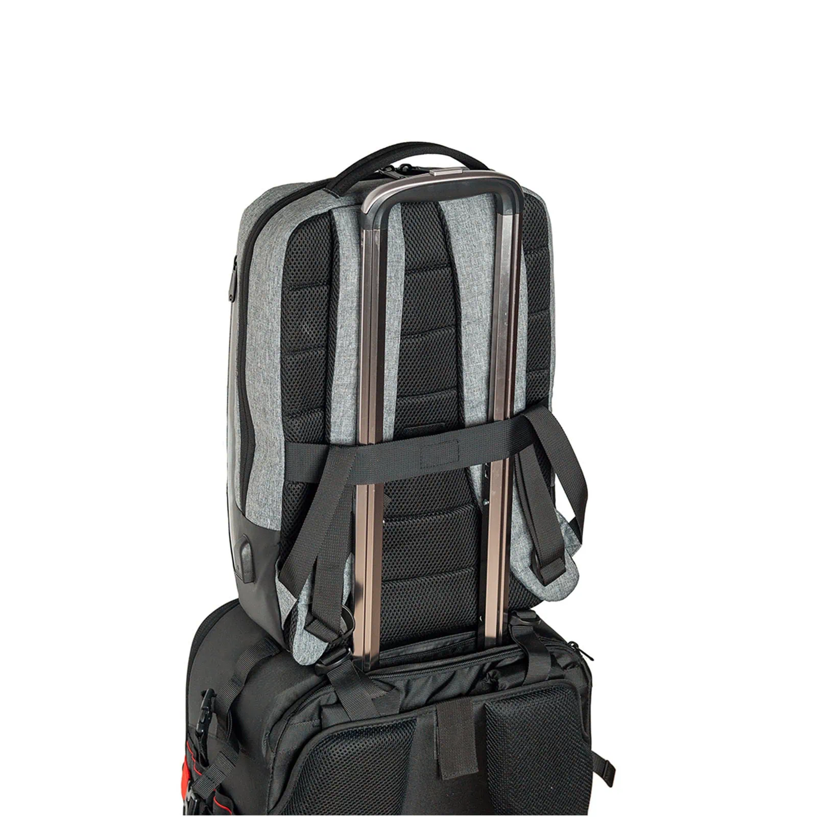 Двухцветный рюкзак для ноутбука 14" имеет основное отделение с карманами-органайзерами. Наружный отдел на вертикальной светоотражающей молнии и вместительный передний карман. Сбоку рюкзака имеется встроенный USB-порт с кабелем внутри для удобной зарядки гаджетов. На спинке имеется крепление на ручку чемодана. Две мягкие регулируемые наплечные лямки.