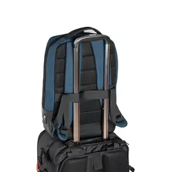 Двухцветный рюкзак для ноутбука 14" имеет основное отделение с карманами-органайзерами. Наружный отдел на вертикальной светоотражающей молнии и вместительный передний карман. Сбоку рюкзака имеется встроенный USB-порт с кабелем внутри для удобной зарядки гаджетов. На спинке имеется крепление на ручку чемодана. Две мягкие регулируемые наплечные лямки.
