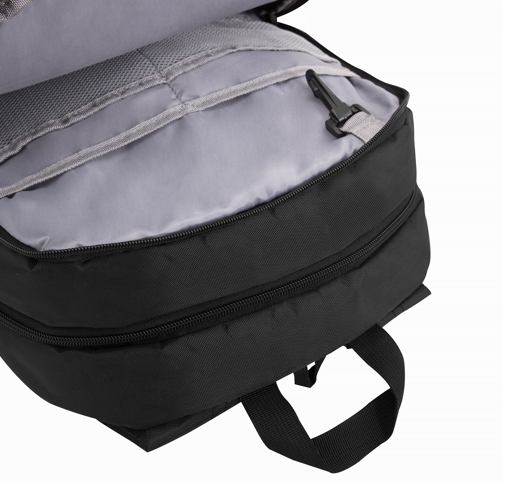 Рюкзак для ноутбука 15,6 дюйма. Одно большое отделение с органайзерами и карабином для ключей, отдельное отделение для ноутбука и отдельное для документов, впереди 1 карман и 2 открытых боковых кармана. Уплотненная мягкая подкладка. Полиэстер 600D.