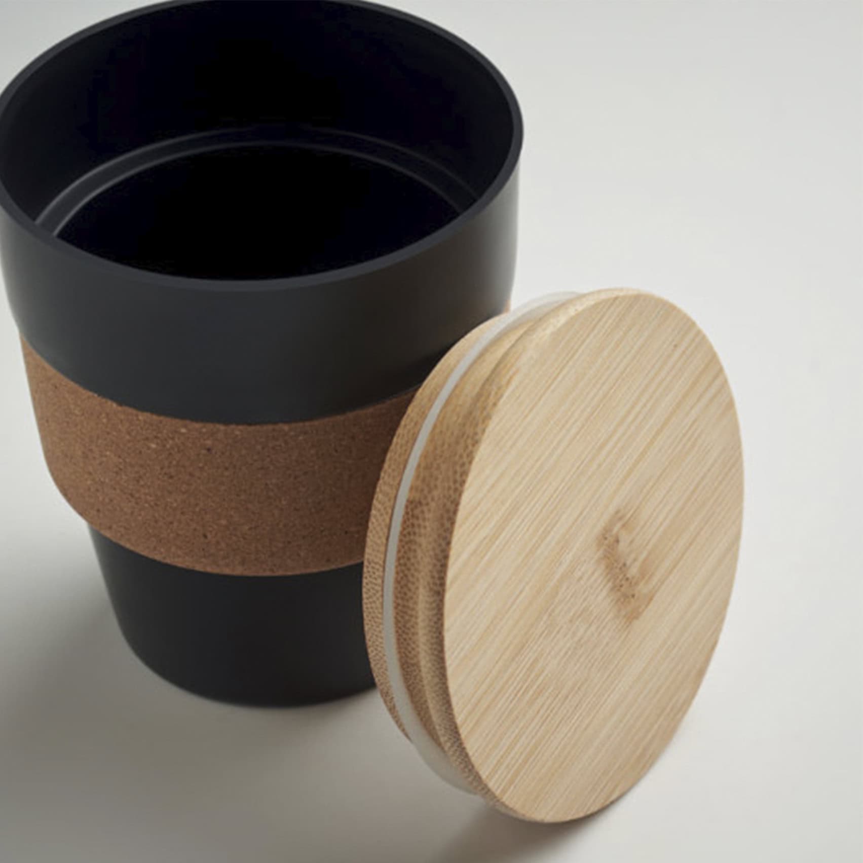 Чашка изготовлена из вторичного полипропилена, что подчеркивает его дружественность к окружающей среде. Естественный пробковый бандаж не только придает эстетическую привлекательность, но и служит теплоизоляцией, обеспечивая комфортный хват при употреблении горячих напитков.