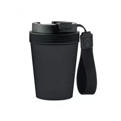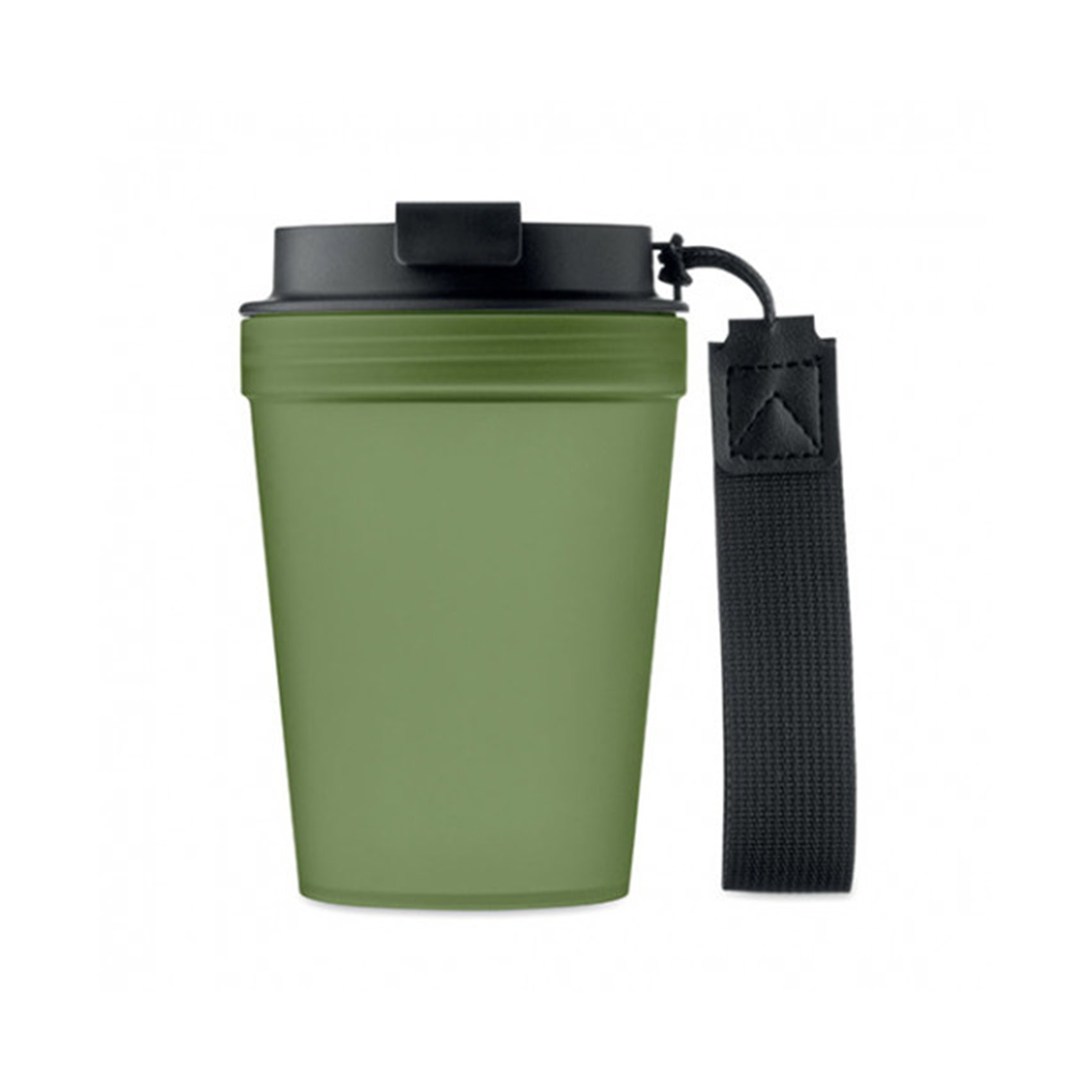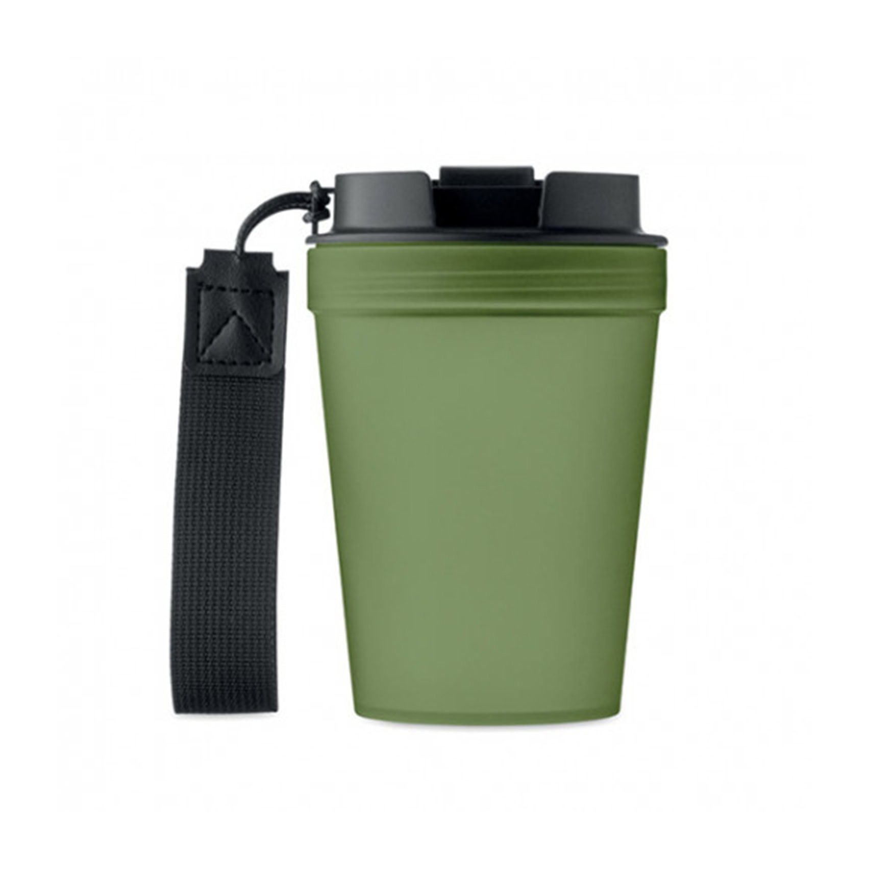 Термочашка с ремешком RPET на 300 мл - экологичная и практичная термочашка для ежедневного использования. Изготовлена из полипропилена (PP), содержащего до 50% переработанных материалов, и дополнена ремешком из переработанного полиэстера RPET для удобной переноски. Герметичная крышка предотвращает протекание, поэтому чашку удобно брать в путешествие, в офис или на прогулку. Объем 300 мл идеально подходит для кофе, чая или других напитков. Обратите внимание: это чашка с одинарными стенками, поэтому тепло от напитка может передаваться на поверхность изделия.