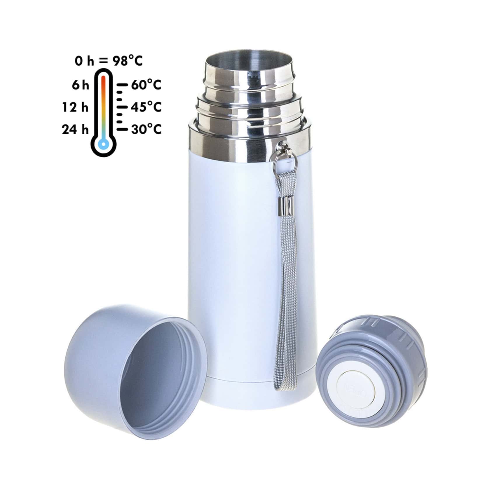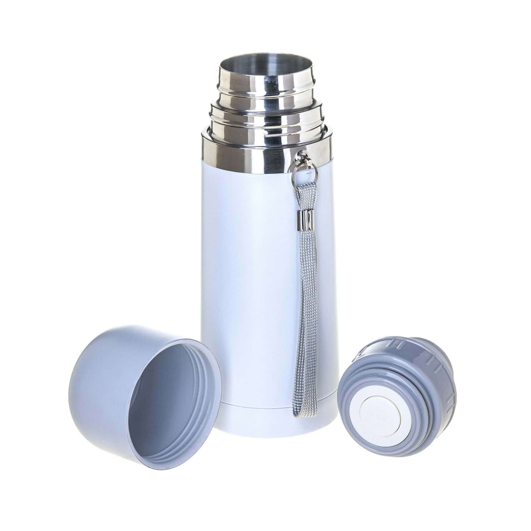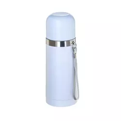 Термос із подвійними стінками з нержавіючої сталі. На корпусі є ремінець на руку. Кришку термоса можна використовувати як чашку.