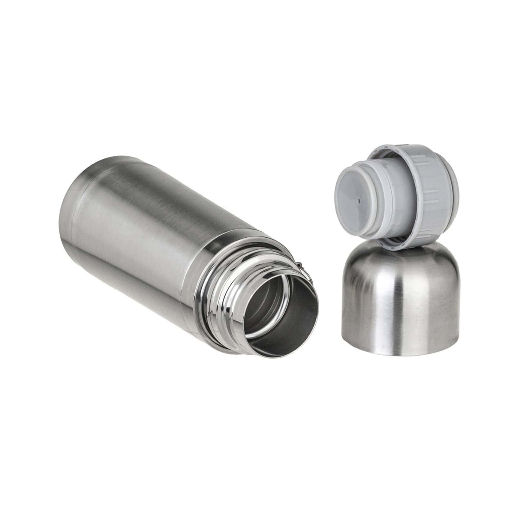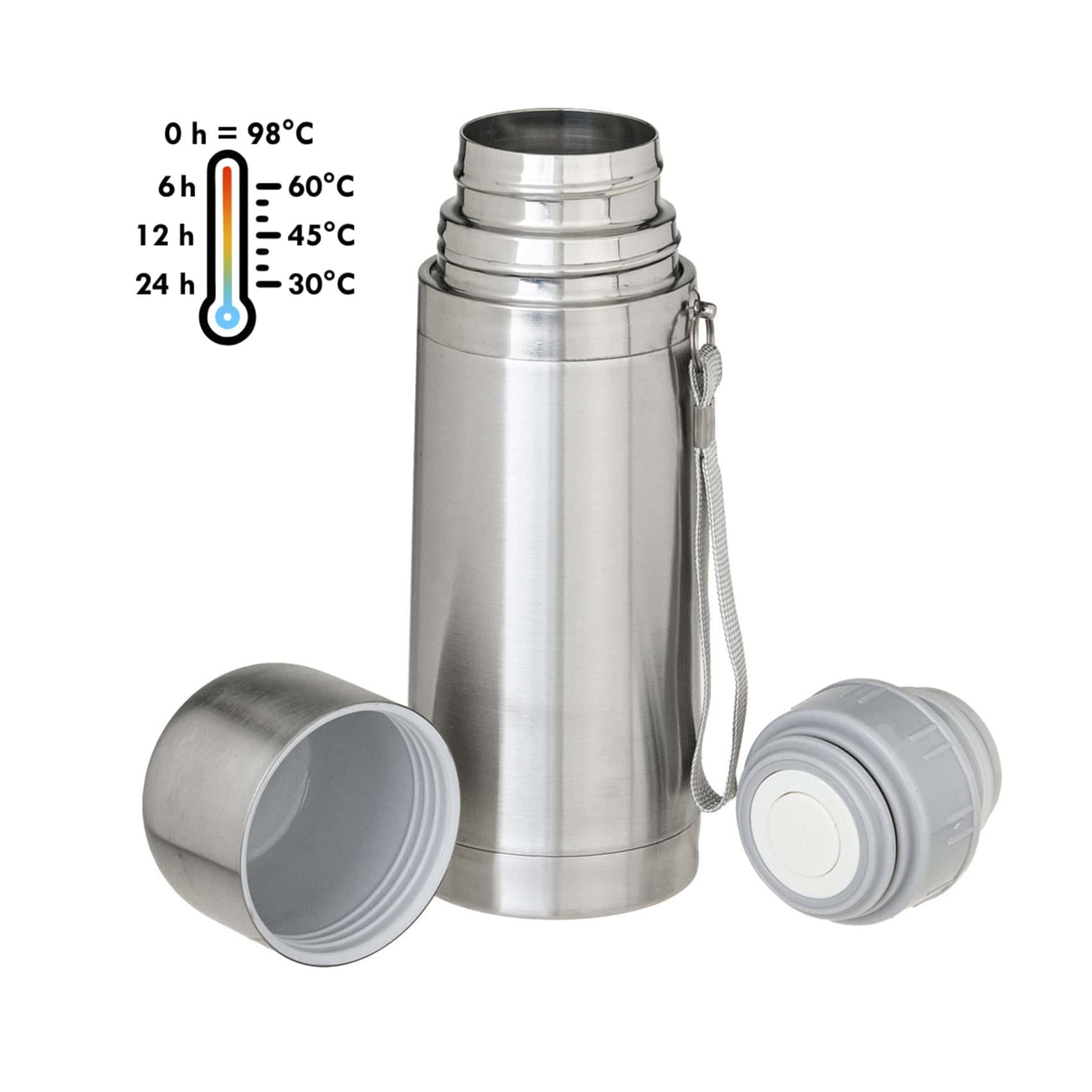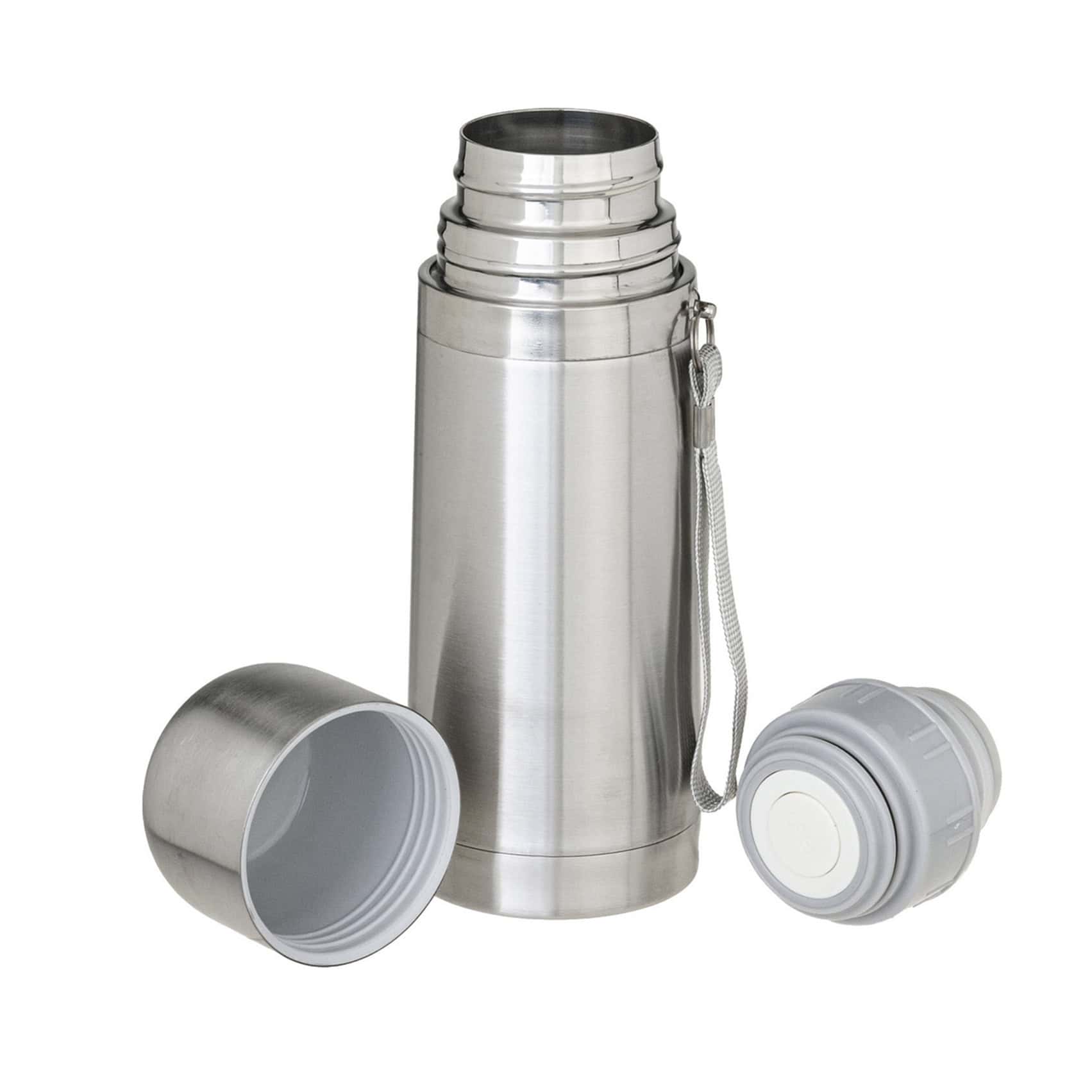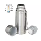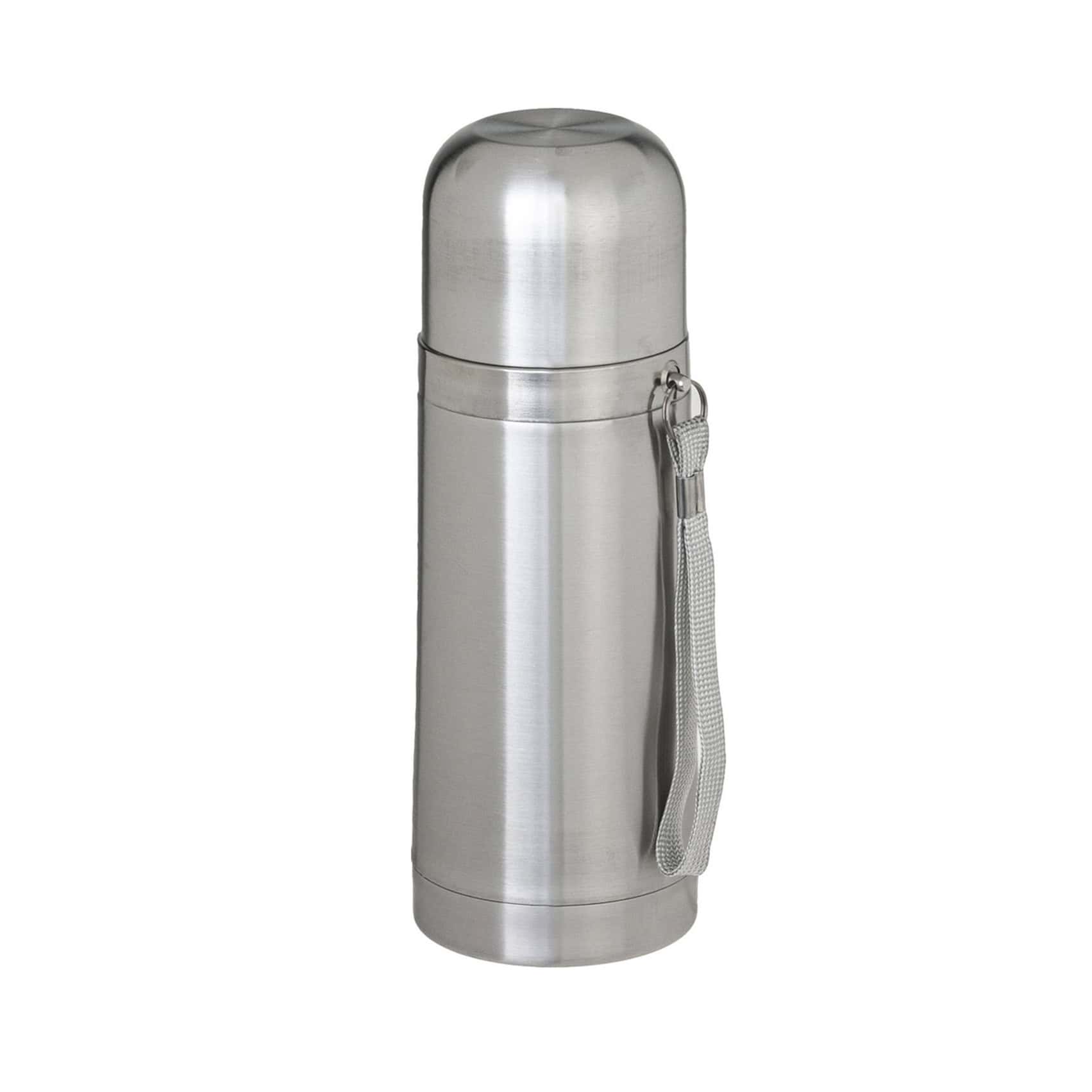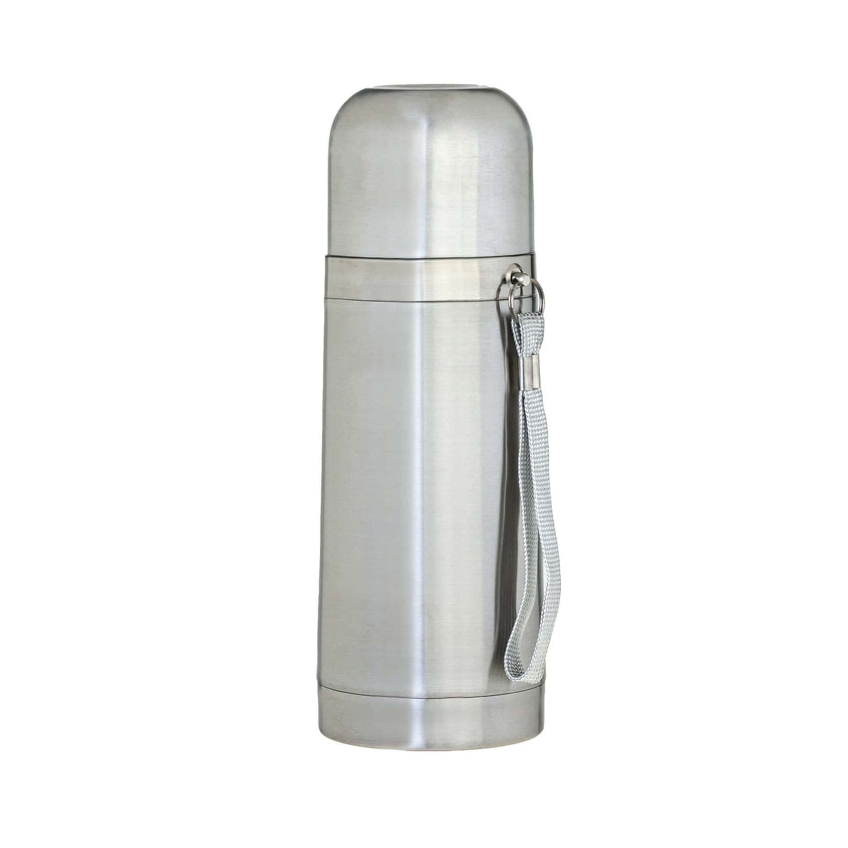 Термос із подвійними стінками з нержавіючої сталі. На корпусі є ремінець на руку. Кришку термоса можна використовувати як чашку.