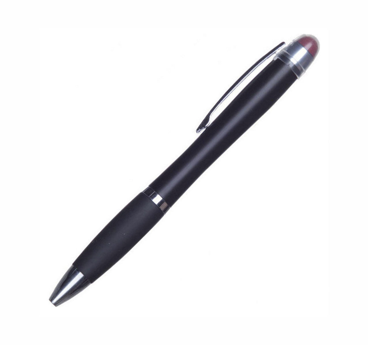 Пластиковая шариковая ручка-стилус с возможностью цветной LED гравировки. Прорезиненный грип, клип и носик из серебристого металла. Ручка подходит для работы с сенсорным экраном. Стилус защищен пластиковым колпачком. В ручку встроены светодиоды, которые позволяют подсветить выгравированный логотип в цвет стилуса. Тип питания - три батарейки (входят в комплект). Механизм - поворотный.
