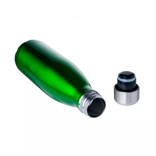 Термос із подвійними стінками з нержавіючої сталі. Корпус виготовлений у формі пляшки.