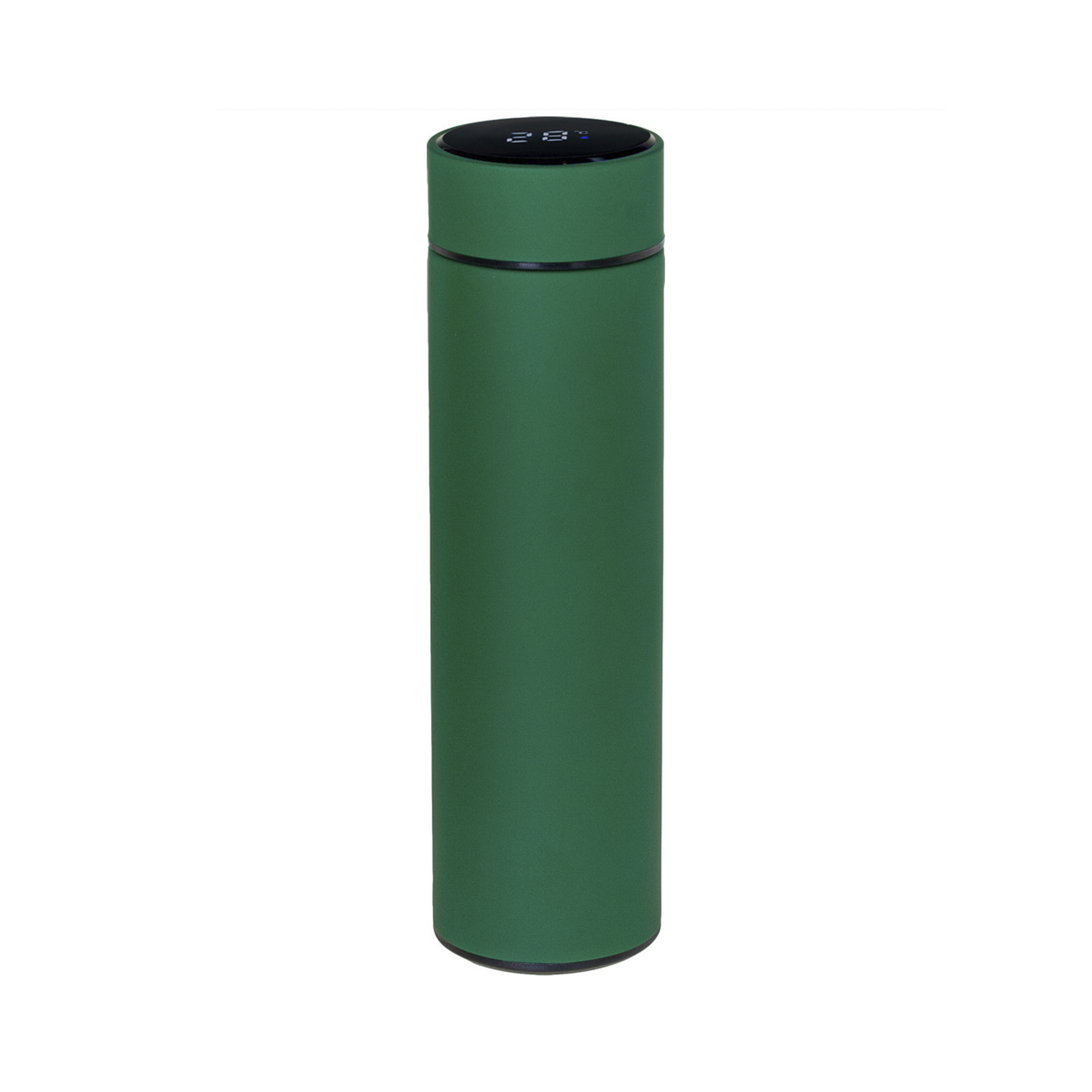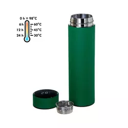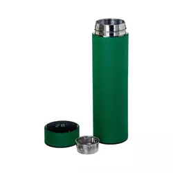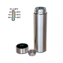 Термос із подвійними стінками з нержавіючої сталі. На кришці розміщено світлодіодний дисплей, що показує температуру вмісту. Температура відображається при торканні кришки. Термос комплектується заварювальним ситечком із нержавіючої сталі.