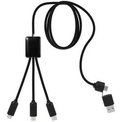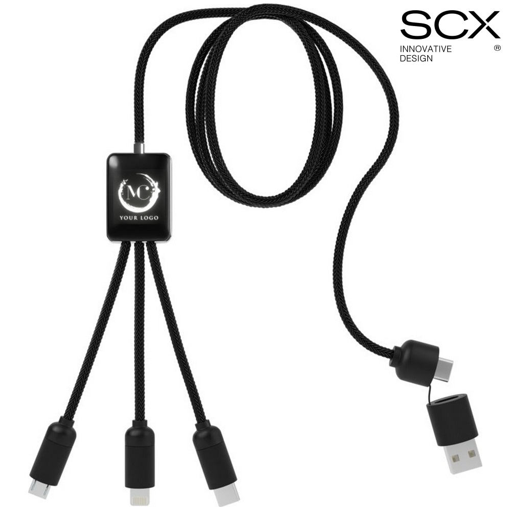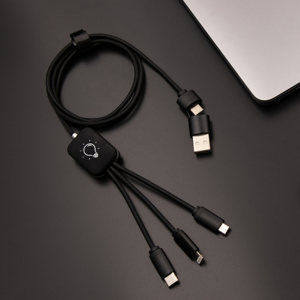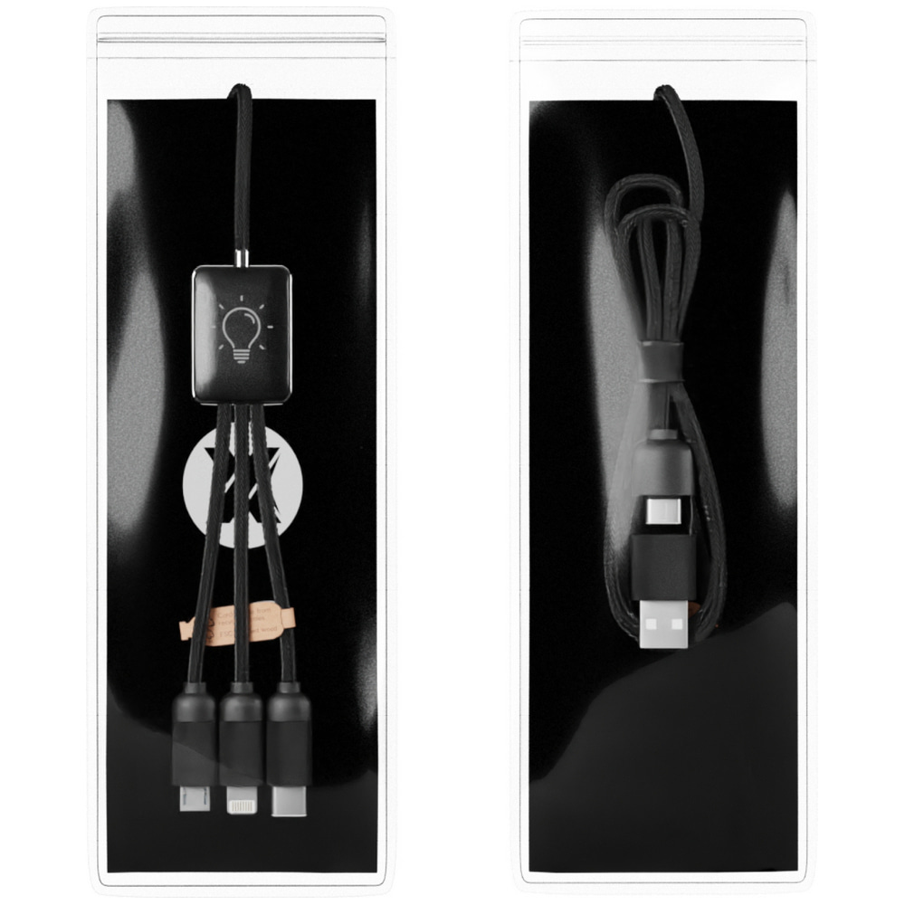 Високоякісний зарядний кабель 5-в-1 (40 W) від французького бренду SCX.design з можливістю LED гравіювання. Пластикова вставка містить білий світлодіод, що дозволяє підсвітити вигравірувані з обох боків логотипи. Металеві роз'єми зі soft-touch покриттям, поверхня кабелю з переробленого PET-пластику.